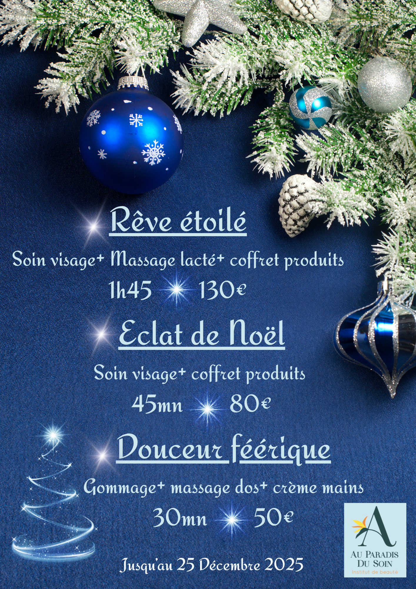 ( Soin visage et massage relaxant aux douces senteurs enveloppantes de Noël suivi d’un véritable flocon de douceur sur votre peau. Un coffret de produits vous sera également remis)